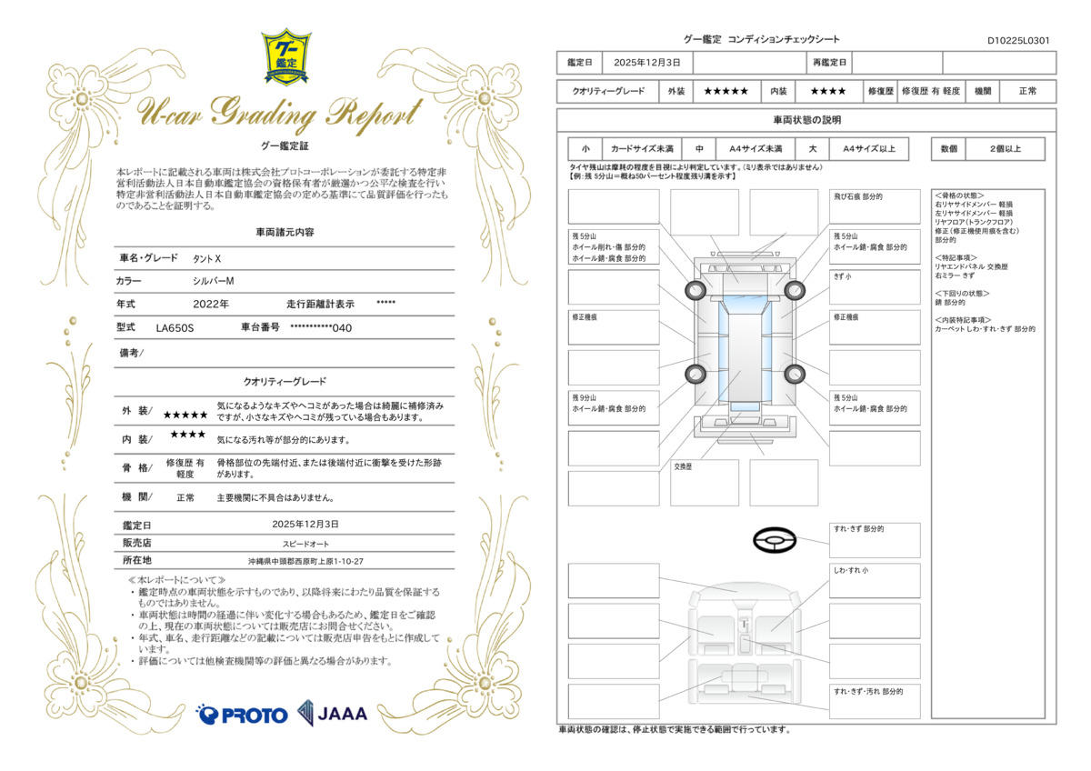 このお車は第三者機関(JAAA)が鑑定を行い、その結果を鑑定証として発行しております。